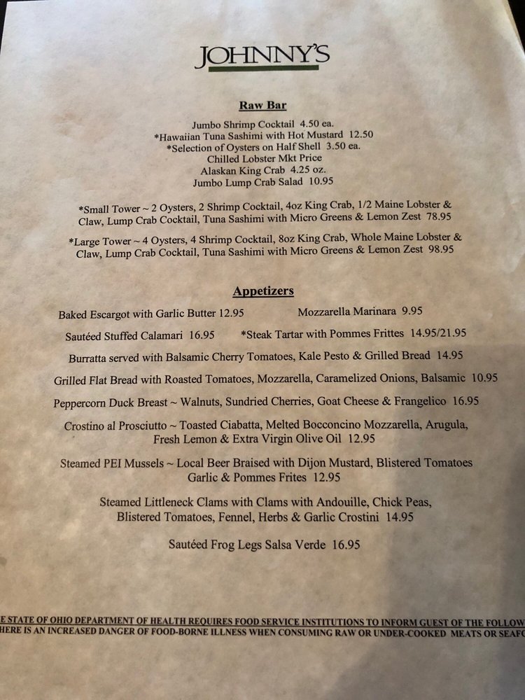 Johnny's Downtown, an upscale Italian seafood restaurant located in downtown Cleveland, offers a diverse menu with many vegetarian options. Customers praise the ambiance, with an old-school charm and attentive service that encourages a leisurely dining experience. Menu highlights include veal stuffed banana peppers, grilled meats, and traditional Italian dishes. The bar side, featuring live music and sing-alongs, adds to the overall charm of the restaurant. While some customers note slight pricing issues, the overall value is appreciated for the quality of food and drinks. Johnny's Downtown is a favorite spot for business meetings, special occasions, and casual dinners, offering a unique dining experience in the heart of the city.